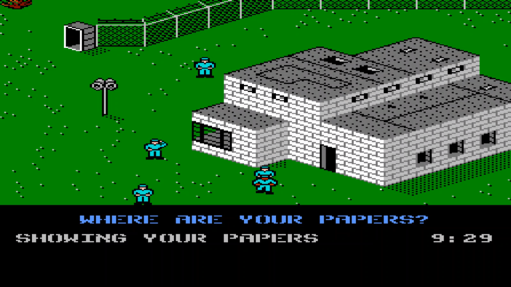 Infiltrator (1986) Developed by Chris Gray Enterprises and published by Mindscape for NES. This is a classic kind of NES game, one that is surprisingly ambitious and unrelentingly punishing. It has a tongue-in-cheek attitude, calling on the main character, Johnny “Jimbo Baby” McGibbits to stop the Mad Leader’s evil scheme. The game is divided into two chunks: three flying missions, where you take control of a helicopter to drop near an enemy base. Here, the second chunk takes place on foot, entering several buildings in disguise to steal an important item, plant explosives, or obtain information. Both of these gameplay styles are… unfriendly, to say the least. The flying missions have surprisingly complex controls, and it’s not unlike a real flight simulator, though the NES’s primitive graphics make it difficult to know where you’re actually going. The on-foot missions are on a strict time limit, and require you to know exactly where to go and what to do like you’re doing a speedrun. Guards will stop you every time they see you and ask for your papers, and whether or not they see through your faked documents is literally random, in which case you need to sleeping gas them and get out. A guard can approve you once, and then in five seconds call a security alarm on you. It’s not surprising that the developer let you choose which order to do the flying and stealth sections in, or else you might never see one of them. If you’re interested… strongly consider a walkthrough.