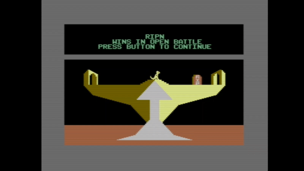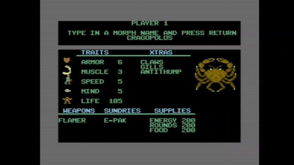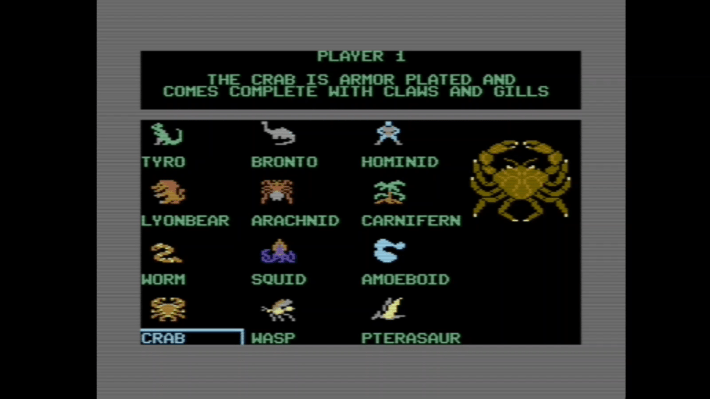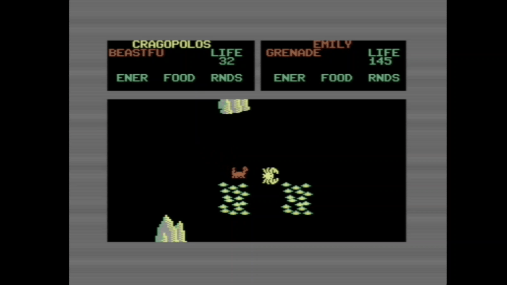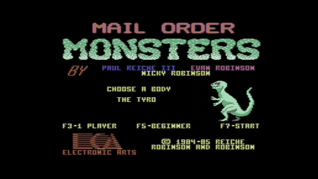 Mail Order Monsters (1985) by Paul Reiche III and Evan and Nicky Robinson, published by Electronic Arts for Atari and Commodore 64. This game is cute, I like it. Pick a monster from a pleasingly large selection of creatures, name it, and duke it out with other monsters. After a fight, you can upgrade your monster’s stats and equip different weapons, because apparently a crab can wield a flame thrower and a stegosaurus can lob grenades. If anything holds this game back, it’s the clunky combat. Actually attacking requires you to hit the attack button and a direction, almost like Smash Bros., but it isn’t clear which to hit first and with what timing, and it isn’t very clear how some of the weapons work. This would make for a fun little game to remake; I could definitely see it as a mobile game, although EA would probably jack it up with microtransactions… sigh…