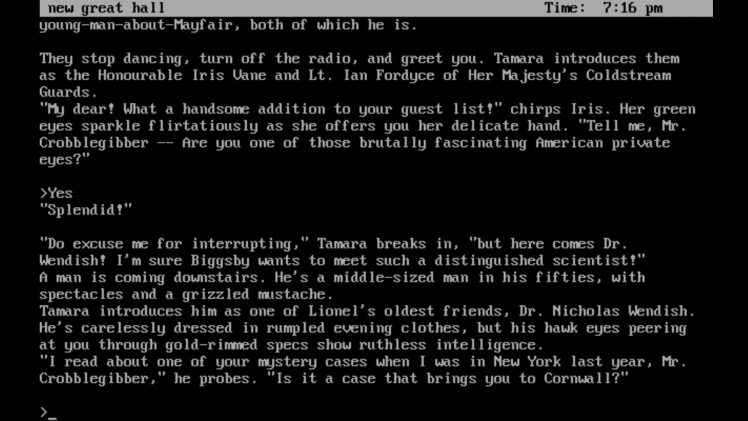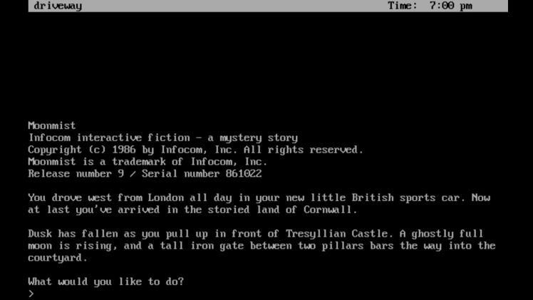 Moonmist (1986) developed and published by Infocom for DOS, Amiga, Apple II, Commodore 64, and others. Fun fact: This is the earliest game I or anyone else can find to feature an explicitly gay character; who that is, you’ll have to play to find out, as it’s integral to a major twist. This is one of Infocom’s classic text-based murder mysteries, where you take the role of an American detective (whose name you can make up; I chose to be Mr. Biggsby Crobblegibber), invited to a spooky English castle , where your friend and the owner, Tamara, has been suffering threats on her life by a mysterious ghost. In addition to Tamara and her fiancee, the eminent heir of the castle, Jack, the game features an assortment of characters who may or may not be as innocent as they seem. Moonmist was co-written by Jim Lawrence, who ghostwrote several Hardy Boys and Nancy Drew novels, and it has that distinctive youth-mystery charm, not taking itself too deadly serious and letting you revel in the fun of a game of Clue. It’s also fairly straightforward, and has been criticized for being too easy; I actually found the incriminating evidence on accident, without even finding the first clue. However, that simplicity also makes it a good entry point for those curious about the text-based adventure genre, in comparison to games like Zork or Jigsaw, which throw you into big open situations that can be quite intimidating. Check it out!