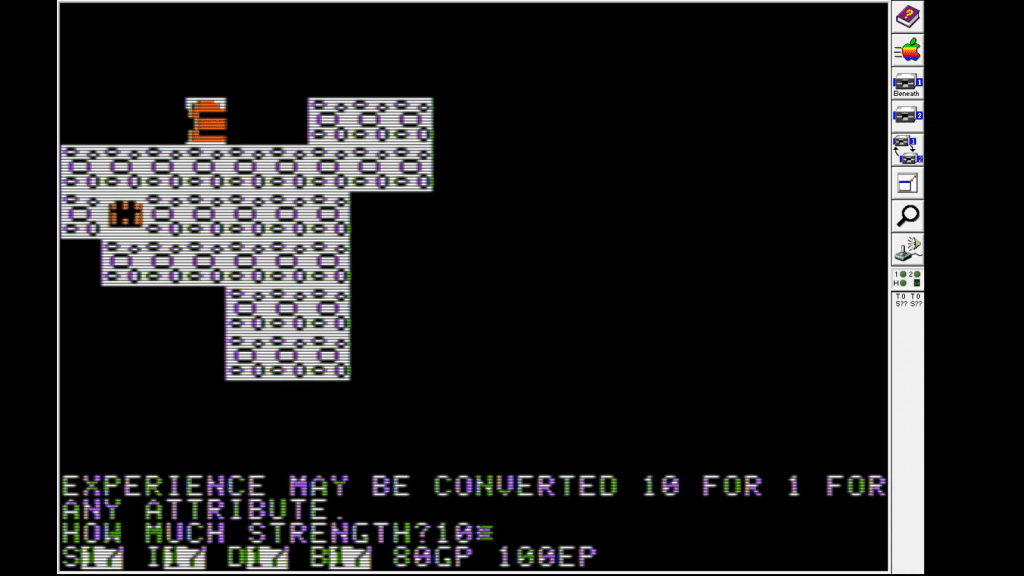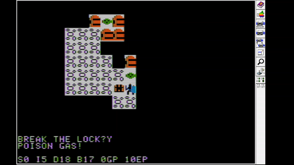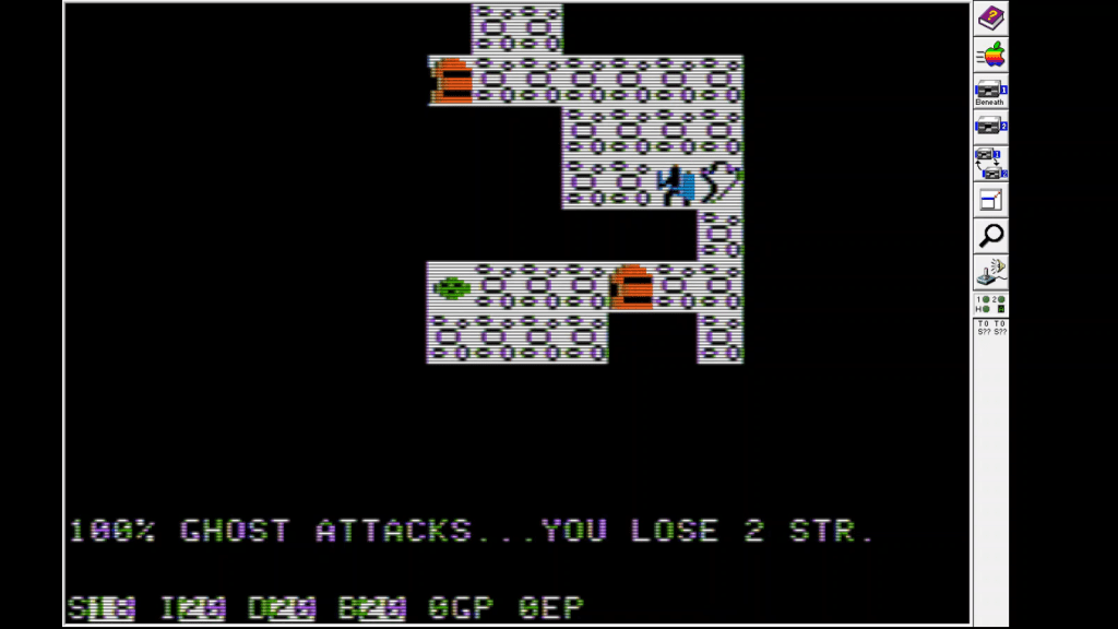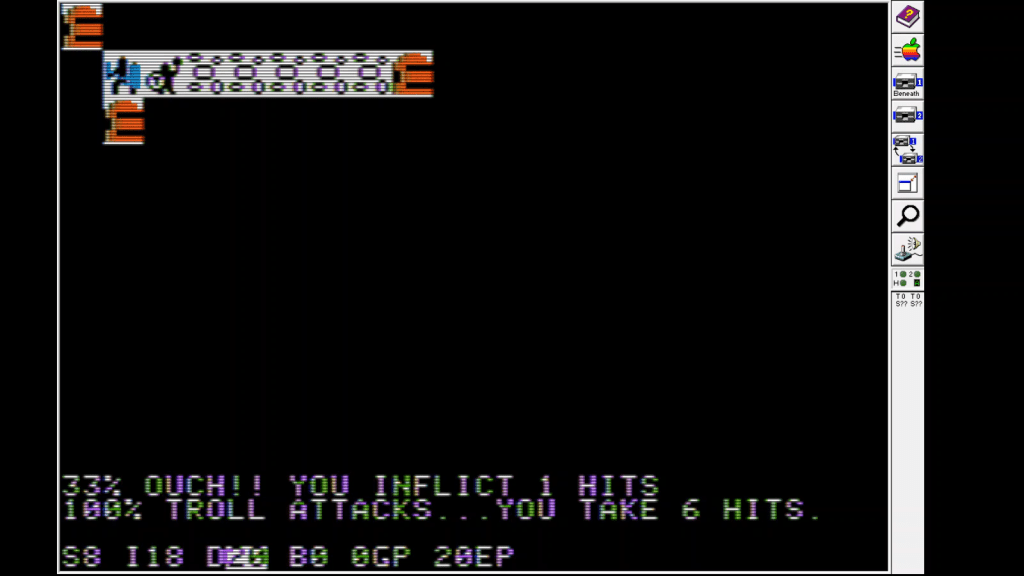 Beneath Apple Manor (1978, re-released 1983) by Don Worth and published by The Software Factory, re-released by Quality Software for Apple II. Would you believe that this was a roguelike game made two years before Rogue? I guess BAM-like doesn’t roll off the tongue quite as well. It carries all the hallmarks of the genre, however, randomly generated dungeons (one of the first to do so), fighting monsters, collecting treasure, even searching for hidden passageways. It’s all implemented well enough for the time, although it would be helpful to pull up the manual with the full list of controls, because you actually use the N, W, E, and S keys to move North, West, East, and South. Once you get into it, it’s an enjoyable enough early roguelike with a punishing difficulty; you’ll need to rest between every fight and often, fleeing is a better strategy. Health regenerates by waiting around, so none of the stress of finding food like in Rogue, but it does leave a bit of a mechanical hole where you just skip forward a few turns and get back adventuring. The ultimate goal is to reach the bottom of the dungeon and fight the dragon to retrieve the “fabled golden apple.” It will take some work to get there, though, because as with any good roguelikes, getting a good run is a process. I prefer the genre’s namesake to this game, if just for being a little easier to jump into, but this is a cool early attempt at an innovative genre. Bonus fun fact: Neither the creator of this game nor Rogue knew about the other, it was just parallel thinking.
