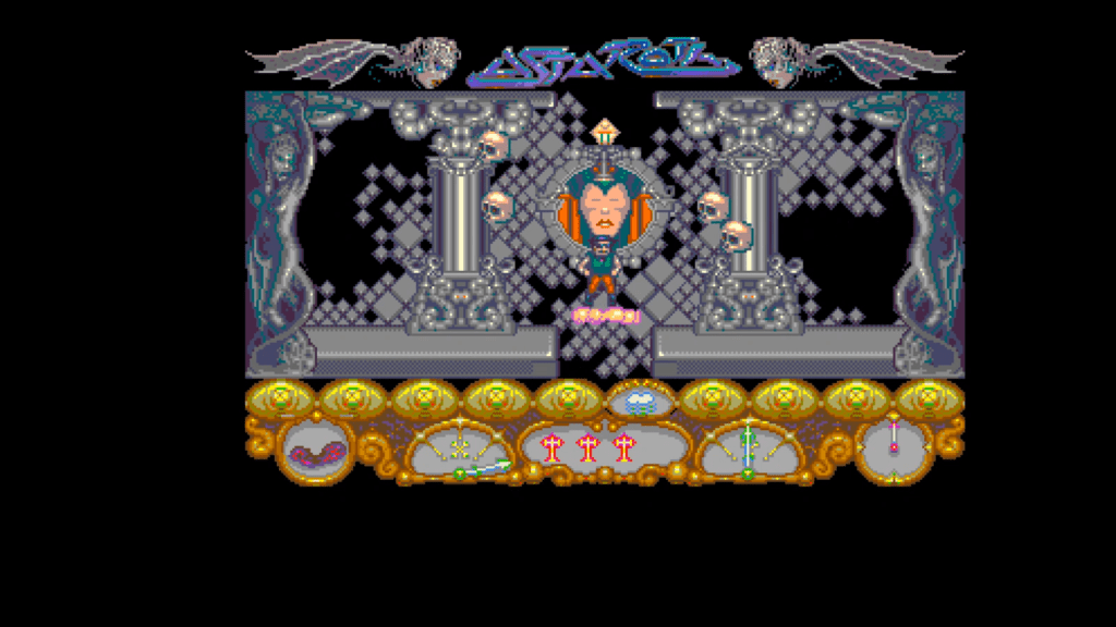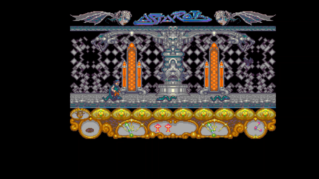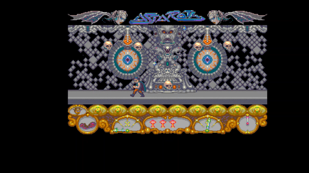 Astaroth: The Angel of Death (1989) by Eldritch the Cat and published by Hewson Consultants for Amiga. I don’t like this game. I want to like this game, it has a cool art style with nice pixel graphics, it has some surprisingly good music, it’s just that playing it is kind of miserable. You are Ozymandias, and must journey through the catacombs of Astaroth, the titular (and tit-ular, as indicated by the title screen) angel of death. The main objective is to collect all nine “mind powers” scattered throughout the game, which will aid you in fighting monsters and solving exploration-based puzzles. It’s almost like a Metroid game, but if Metroid hated you. The very first screen has unavoidable damage, as you begin paused in the mind power selection options, even though you don’t have any yet, only to unpause and be faced with a skull enemy careening toward you. Ozymandias has a Castlevania-like fixed jump arc and a deceptively big hitbox, also, when you hit down to duck, he does this weird little fiddling motion that almost looks like kung-fu before he actually kneels down. Basically, the odd sluggishness of your character means you will be getting hit a lot. This isn’t *too* great of an issue, because a lot enemies just… explode on contact, but there’s these snakes… these snakes… Oh man, the snakes. They move back and forth and won’t explode after damaging you; this is when I realized that this game has no invincibility frames, so every second you’re touching the snake, it’s annihilating your health. Everything in this game is like this, weird, cryptic, clumsy. There’s these screens where you have to weave past two different environmental hazards in a rhythm, but I’m convinced that the starting positions of the hazards aren’t fixed and actually depend on frame speed or something like that, because I would go through once and it would be actually impossible to avoid getting hurt, and then the next time it seemed to work as intended. Quite a shame, what with the legitimately cool, H.R. Geiger inspired visuals, but I wouldn’t recommend this unless you have a lot of patience. Maybe if I start streaming, I could do this as an endurance run.