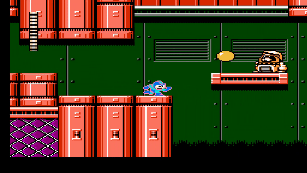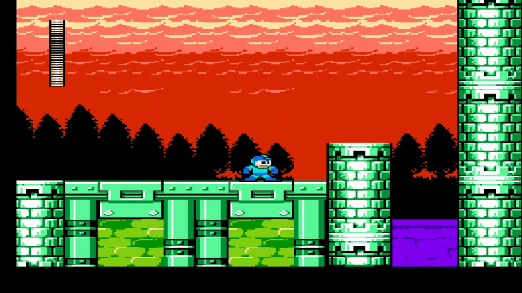 Maybe it’s mad science, because his level is in a castle. I love the first screen: Megaman standing in front of a drop into the fortress, which is a weird lime green and purple stone compound, against a late-day sky, the sunset casting warm colors over a thick bed of clouds, the trees pure black, silhouetted in the background. Interestingly, the colors of some stages change on revisit, and this one swaps for green pillars and fuschia walls. The sky turns gray, it feels like whatever once happened here is over.
