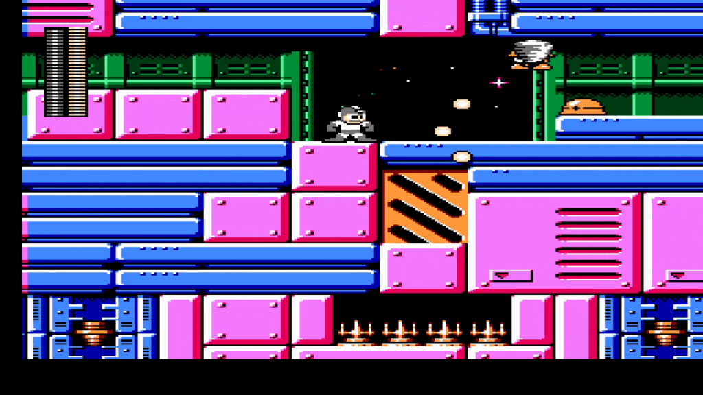 Stage 2 is in space, apparently. It’s got a nice kishotenketsu example in the form of this pit you fall into and need the Jet to fly out of, then later they introduce spikes and enemies into the equation. Not much to say besides that. The boss has a nasty case of slooooow dooooown as it drops rocks from the ceiling that break apart, but every one of the NES Megaman games suffers from that when things get too hectic. This series has a lot of instances of pushing the bounds of polish and care in place of mechanics, and unfortunately that ambition outpaces the technology.
