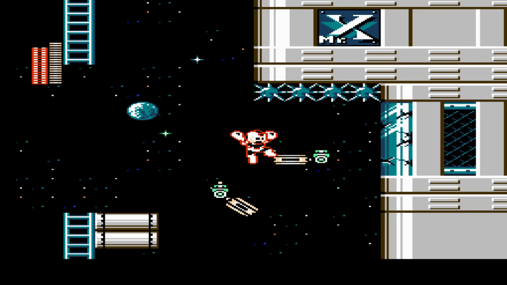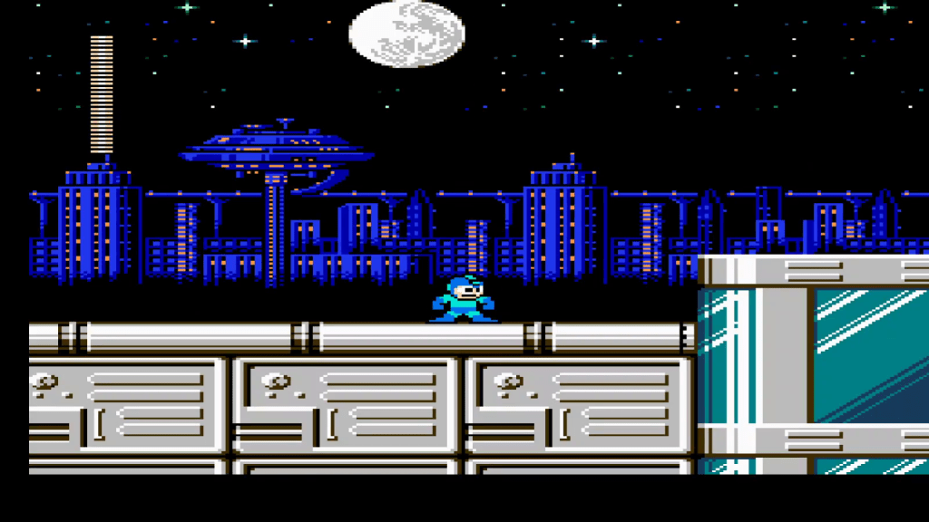 Because I haven’t praised this game’s art direction enough, I want to point out how wonderful the atmosphere is here. There’s a long, futuristic city skyline lit in dark blue under a full moon and a sky overflowing with stars. It’s kind of an acknowledgement of the world these games take place in that’s subtle, but there. Paired with the background music, it takes on a melancholy quality. The windows are illuminated with warm orange lights; someone is up late, working or living. But Megaman can’t stop now, these are the people he’s fighting for the sake of.