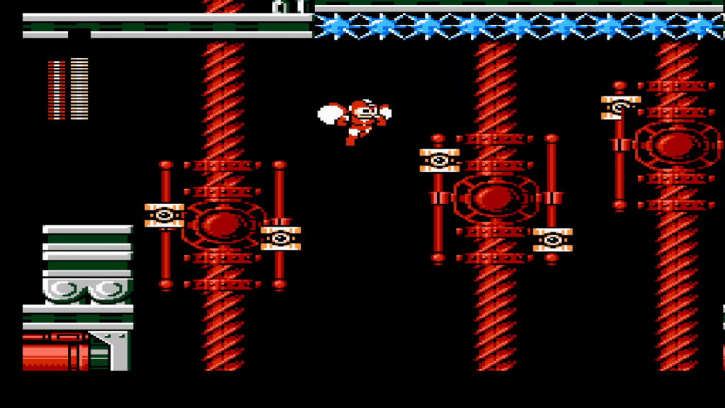 At this point in Megaman games, the fortress levels, everything starts to open up from a design perspective. Because you can choose any of the Robot Master stages in any order, the level designers had to craft each stage as if you had nothing but your Buster. There are extra secrets and alternate paths, but nothing that requires you to have any other weapon or item. Now, all of the weapon getting and item picking is done, and you will have to use every tool at your disposal to make it through the fortress.