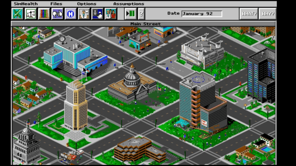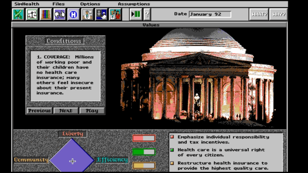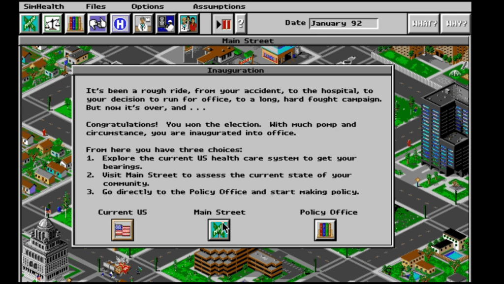 SimHealth (1994) by Thinking Tools and published by Maxis for DOS. Well, I didn’t think that this game would be so political. This is a Sim game that doesn’t put you in control of a hospital, but the entire American health care system, sheesh! After getting into a car accident and feeling dissatisfied with the treatment you received, you decide to run for office with the goal of reforming health care– easier said than done. You start by selecting your positions on four different, loaded topics, ranging from how much personal responsibility your system will have in mind to whether or not health care is a basic right. Once your term begins, it doesn’t get any easier. You’re regularly hounded by your advisors and medical professionals about policy; raise costs and the care improves, but it’s less accessible; lower costs and clog up the system. Maybe you can put have employers pay for more of the share? Well, now small businesses are getting crunched. If anyone ever asks me why I’m not a politician, I’ll show them this game. It lacks a lot of the charm and playful attitude of Maxis’ other Sim games, and rightfully so, as it was developed in the middle of the Clinton administration’s own tussle with health care policy. There is a victory state, but the game is a little too overwhelming for me to play enough to get there, although it drew some criticism on release for certain extreme policies being easy wins. I’d say that if you’re curious about health care, give it a shot, if just to get a taste of the stresses of impossible politics. Entertainment Weekly’s review of this game said, “For a vivid demonstration of just how complex — and boring — the health care crisis is, try spending a few hours with SimHealth, which lets you do what Hillary Clinton couldn’t: design a successful national health care system.” Yikes!