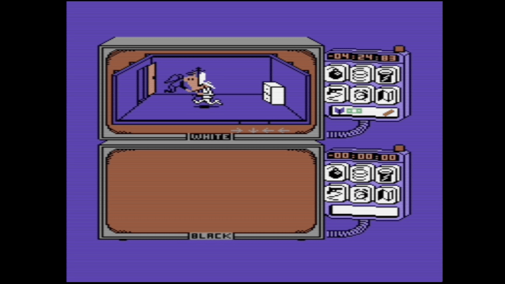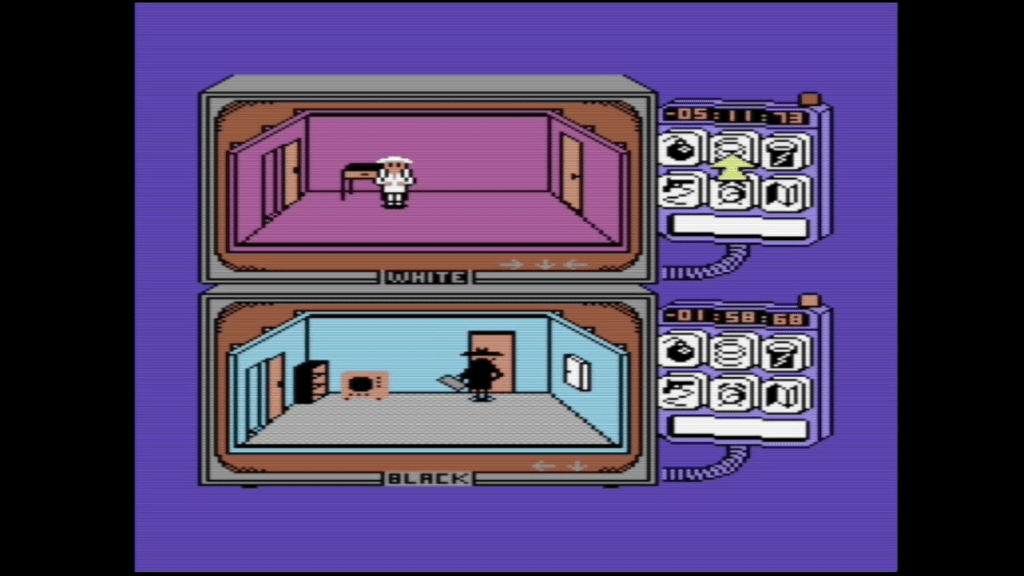 Spy vs. Spy (1984) by First Star Software, published by Beyond Software, Tynesoft, and Wicked Software for Amiga, Apple II, Atari ST, Commodore 64, Game Boy, NES, and more. As a longtime fan of Antonio Prohias’ MAD Magazine strip of the same name, I was curious as to how the Black and White Spies’ antics would be translated to video games. This is a two-player competitive game of espionage and item hunting, where each player takes control of a spy and runs around a series of rooms collecting four different objects in a briefcase and escaping through the exit to the airport. Every drawer, painting, and TV in a room can be searched, and each player can plant one of six traps in any of these spots. They range from bombs to buckets of water over doors, and serve to slow your opponent down. You respawn after dying, but taking any damage, whether it be from the club-wielding combat or the traps, detracts from your time limit. Once one player’s clock runs out, they lose, but the remaining player still needs to to complete the objective. There’s a nice amount of depth for the time, with special items you can find to disable specific traps, and the looming threat that the next shelf you check has an explosive waiting for you. If you don’t have a friend to play against, it also offers an impressive AI opponent with multiple levels of difficulty. While the graphics are pretty simple, the strip itself had a minimalist artstyle, and this game was even praised at the time for its visuals. If I had to give a warning about anything, it would be that, for some reason, player 1 controls with the second joystick port, which really confused me for a minute. This subgenre is really cool and I’d like to see more of it; it’s sometimes called “trap-em-up,” which… eh… might have some… different connotations in today’s age.