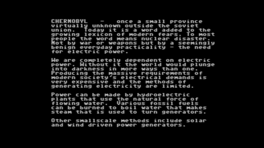 Chernobyl: Nuclear Power Plant Simulation (1987), developed and published by Cosmi Corporation for Commodore 64. Cosmi is, from everything I can find, a pretty shoddy developer, which makes this title all the more peculiar. It’s an incredibly dry simulation of a nuclear power plant, opening with a short essay about the history of nuclear power and the careful balance of clean energy vs meltdown. The player enters commands to view different parts of the facility, mainly the control rods and various gauges. The opening walls of text contain a guide on practically every command as well as procedures for starting up, monitoring, and shutting down the plant. This is a very involved game; I said before that SimHealth tried to capture the stress of legislating health care, well, this game does the same, except the looming threat is in its very title. The message is clear: This stuff is complicated. It’s worth noting the frankly unnerving soundtrack, by which I mean the constant low hum of machinery. At first, I thought that my C64 emulator was just being really CPU intensive for some reason, and then I realized that that is the sound of thousands of lives being in your hands. I can’t think of any other programs about simulating a nuclear power plant, and I think that, for what it is, it’s quite a good display of the labors of such a task. I wouldn’t know, though. Who do I look like, Homer Simpson?