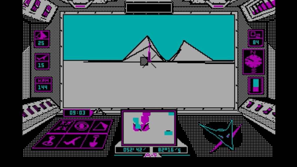 Arcticfox (1986) by Dynamix and published by Electronic Arts for DOS, Amiga, Atari ST, Apple II, Commodore 64, and ZX Spectrum. I think that of all the pre-Wolfenstein pseudo-3D games, Arcticfox deserves the most recognition. This is a first-person tank simulator that controls pretty well all things considered. It’s the far flung year of 2005 (woah!!), and aliens have come to steal the Earth’s oxygen, and the player must commandeer the premiere supertank, Arcticfox, to stop them. Every level, you’re tasked with destroying the alien’s structures and vehicles to progress; it’s pretty simple, but there’s a lot of room for strategic depth with homing missiles, mines, the rear-view camera, and digging into the snow where you can fire missiles from. While the sound is sparse, I adore its use of CGA graphics; I mean, when you only have four colors to work with, why not set your game in the snow? Arcticfox is one of those games that’s easy to understand (once you get the manual in front of you), but that you can really get sucked into. There’s just something satisfying about how fast you can move through the snow, shooting these big shells at wireframe tanks and buildings. The team who developed this game would go on to do a few more notable releases such as Red Baron, The Incredible Machine, and MechWarrior.