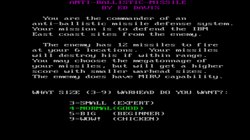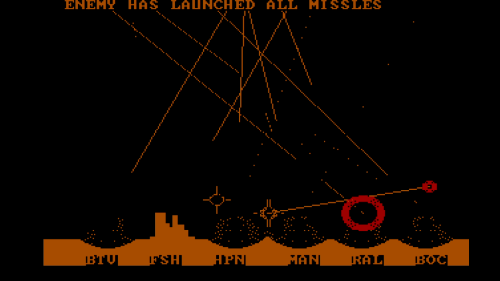 Anti Ballistic Missile (1980) by Silas Warner, published by Muse Software for DOS. This is also technically a review of Missile Command for Apple II, because they’re essentially the same game. This is from a time before home computer game programmers were widely comfortable stepping outside the confines of arcade gameplay, and you can basically get the entire scope of what it has to offer in about a minute. You are tasked with defending six east coast cities from missiles fired by “the enemy.” You move your cursor over the lines and hit fire, try to be as fast as you can and protect as many cities as you can until the time runs out. The difficulty selection is kind of interesting to me, you get to choose not only your enemy’s missile speed, but also the size of your ABM’s explosion radius. This interest is purely historical, though, because most difficulty settings boil down to a single “Easy, Normal, or Hard?” menu without an idea of the gameplay changes; the only other title that comes to mind that lets you tune both sides is Scorched Earth and those that followed in its Artillery Strategy footsteps. I should note that the default 3,000 cycles in DOSBox is waaaaay too fast for this game, the highest comfortable speed I found was 500.