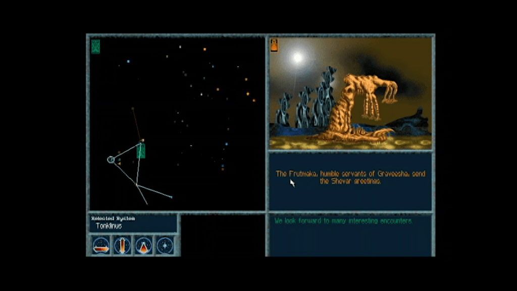 I had no idea that what I was playing was a (now deleted) port of a classic PC game. Developed by The Logic Factory and published by Virgin Interactive in 1995 for DOS, Ascendancy is a 4X game. That stands for eXplore, eXpand, eXploit, eXterminate, and you do just that. You take control of one of twenty alien races. Each one has multiple paragraphs of lore, and a unique ability. After setting the size and population of the galaxy, you’re dropped into your home world, where you need to build structures to enhance one of three areas. Factories raise your industry and let you complete building projects faster, research centers raise, well, research, and speed up your scientific advancements, and farms raise the rate your population grows at.